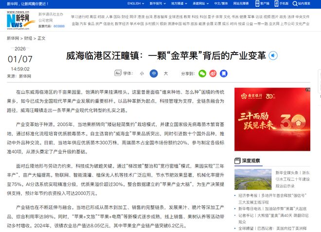 1月7日,《新华网》刊发《威海临港区汪疃镇:一颗“金苹果”背后的产业变革》一文,报道汪疃镇以品种革新为起点,科技管理为支撑,全链条融合为路径,走出一条苹果产业现代化转型的扎实之路。以下为报道全文:在山东威海临港区的千亩果园里,饱满的苹果挂满枝头。这里曾是面临“谁来种地、怎么种”困境的传统果乡,如今已成为全国现代苹果产业发展的重要标杆。以品种革新为起点,科技管理为支撑,全链条融合为路径,威海汪疃镇走出一条苹果产业现代化转型的扎实之路。